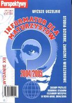 Najobszerniejszy, najpopularniejszy i najbardziej aktualny informator o wyższych uczelniach i szkołach policealnych w Polsce, prezentujący w atrakcyjny sposób wszystkie możliwości nauki dostępne dla absolwentów szkół średnich w roku akademickim 2004/2005.Pełna oferta wszystkich wyższych uczelni - państwowych i prywatnych - adresowana do kandydatów na studia dzienne, zaoczne i wieczorowe: kierunki studiów, zasady przyjęć, zakres egzaminów wstępnych.Wszystkie interesujące was terminy w rekrutacji 2004: dni otwartych, składanie dokumentów, egzaminów pisemnych i ustnych, rozmów kwalifikacyjnych, rekrutacji dodatkowej ...Oferta wszystkich szkół policealnych w Polsce (adresy, nauczane zawody i specjalności, kryteria przyjęć).