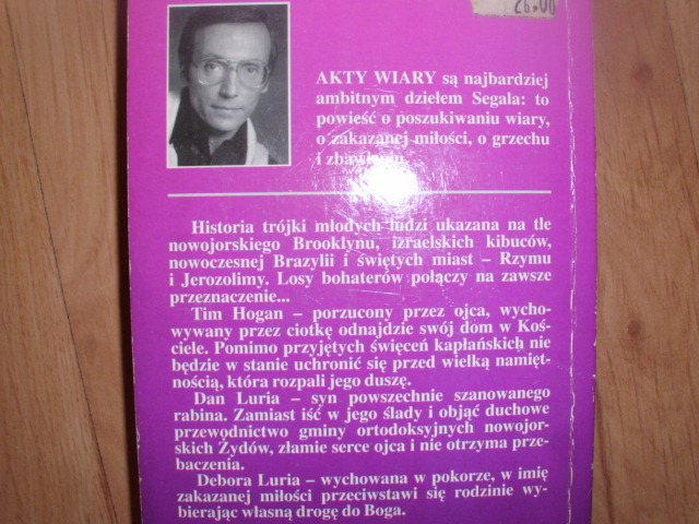 "Akty wiary" są najbardziej ambitnym dziełem Segala: to powieść o poszukiwaniu wiary, o zakazanej miłości, o grzechu i zbawieniu. Historia trójki młodych ludzi ukazana na tle nowojorskiego Brooklynu, izraelskich kibuców, nowoczesnej Brazylii i świętych miast - Rzymu i Jerozolimy. Losy bohaterów połączy na zawsze przeznaczenie...