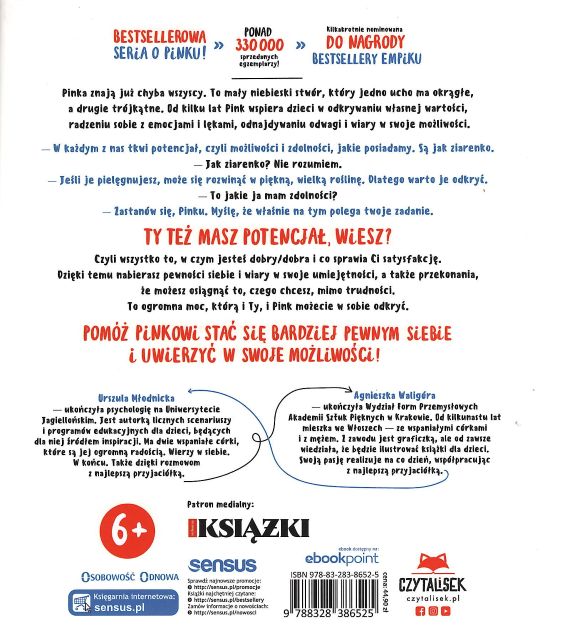 Kontynuacja książki pt. "Jesteś ważny, Pinku!". Pinka znają już chyba wszyscy. To mały niebieski stwór, który jedno ucho ma okrągłe, a drugie trójkątne. Od kilku lat Pink wspiera dzieci w odkrywaniu własnej wartości, radzeniu sobie z emocjami i lękami, odnajdywaniu odwagi i wiary w swoje możliwości. - W każdym z nas tkwi potencjał, czyli możliwości i zdolności, jakie posiadamy. Są jak ziarenko.- Jak ziarenko? Nie rozumiem.- Jeśli je pielęgnujesz, może się rozwinąć w piękną, wielką roślinę. Dlatego warto je odkryć.- To jakie ja mam zdolności?- Zastanów się, Pinku. Myślę, że właśnie na tym polega twoje zadanie. Ty też masz potencjał, wiesz? Czyli wszystko to, w czym jesteś dobry/dobra i co sprawia Ci satysfakcję. Dzięki temu nabierasz pewności siebie i wiary w swoje umiejętności, a także przekonania, że możesz osiągnąć to, czego chcesz, mimo trudności. To ogromna moc, którą i Ty, i Pink możecie w sobie odkryć.
